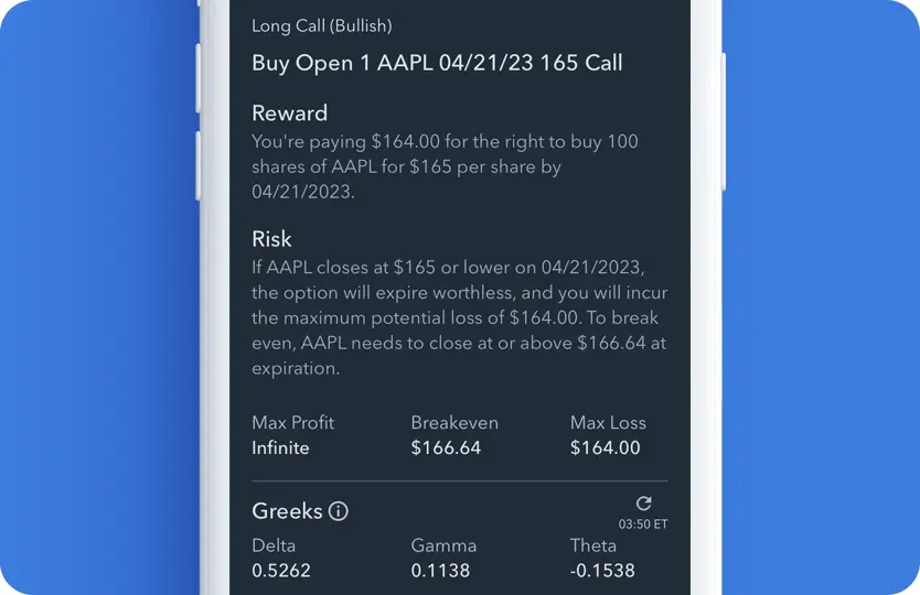- View your potential maximum gain or loss before you place an order with the Risk/Reward Profile.